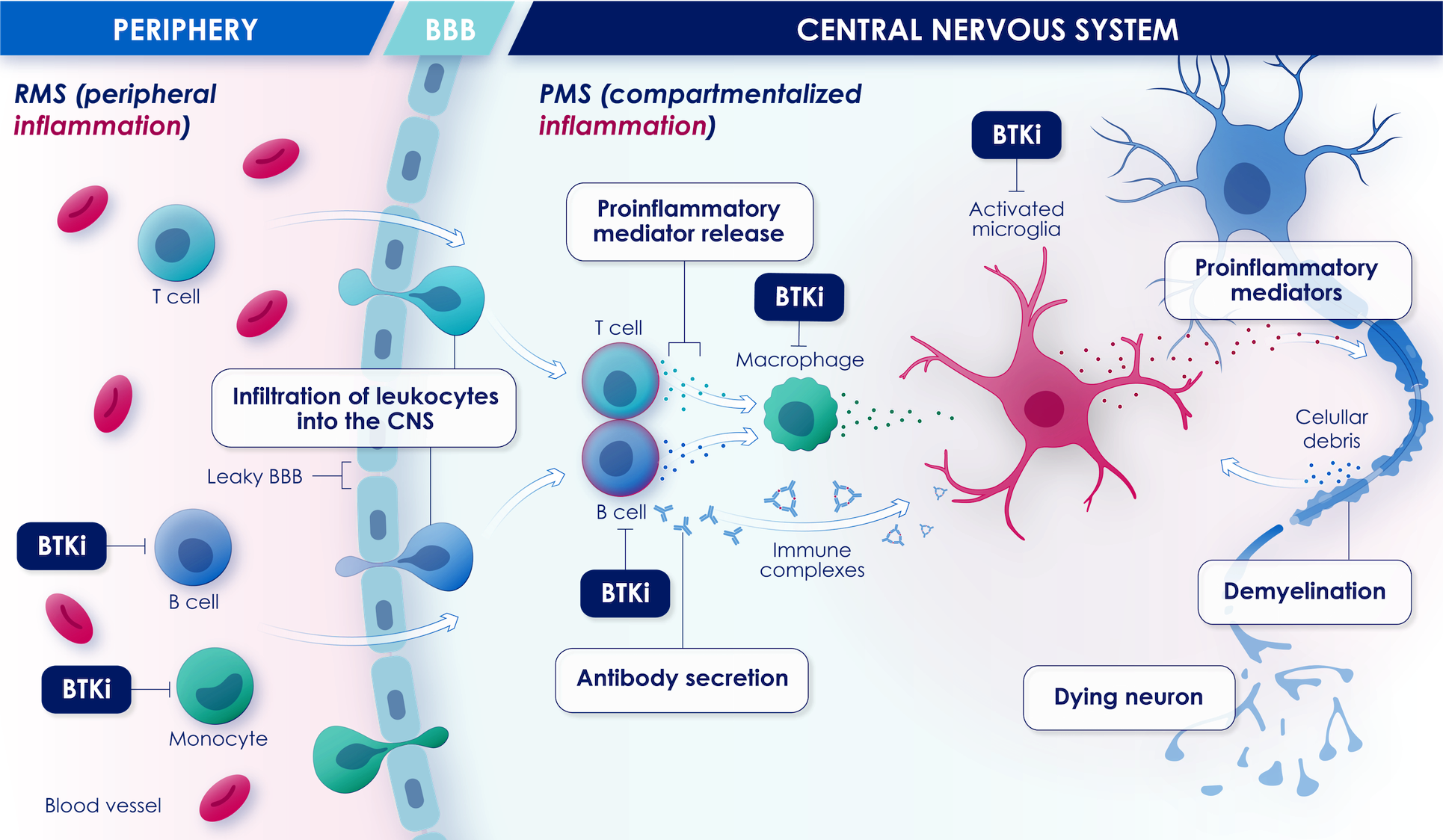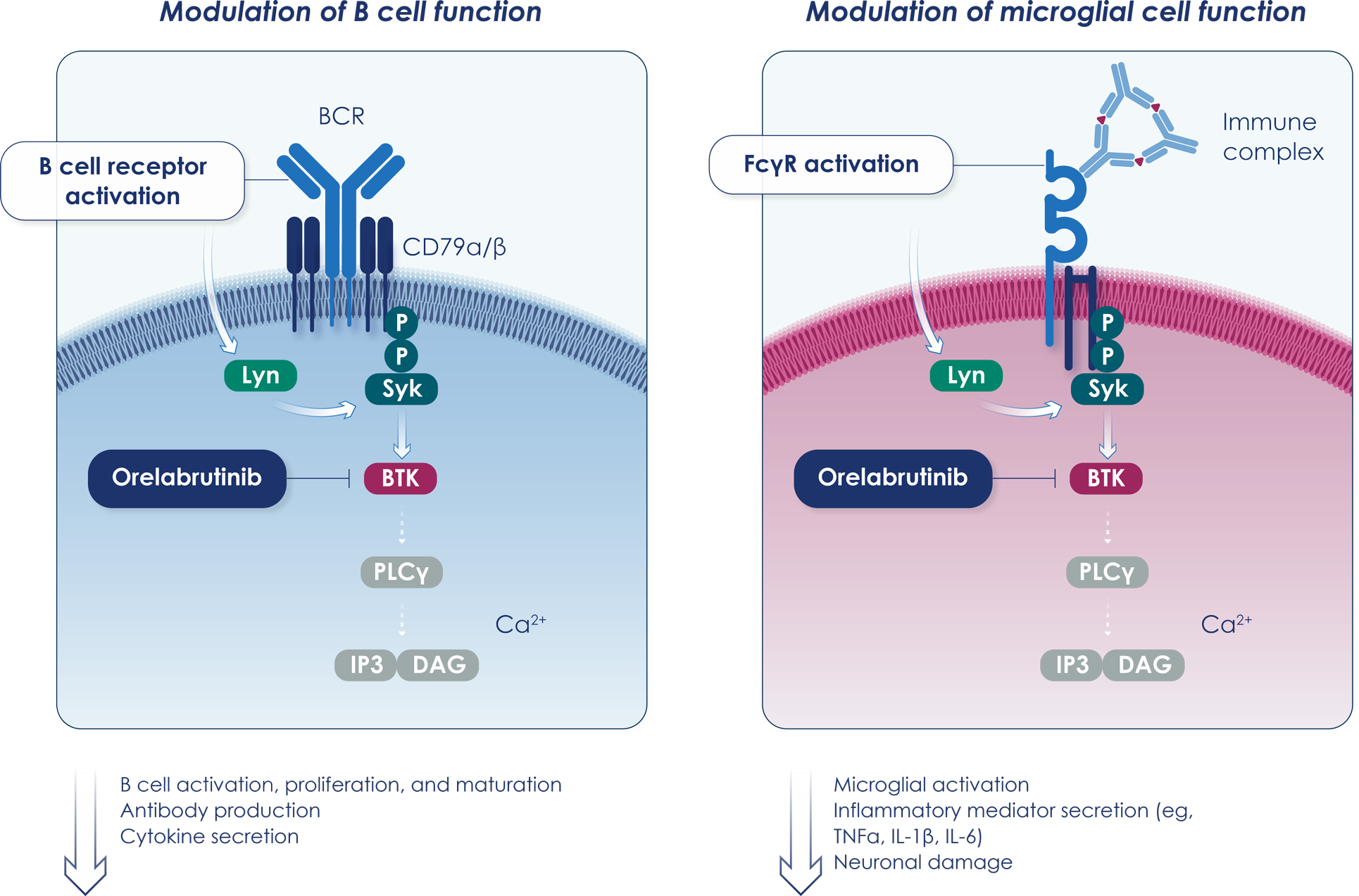 Orelabrutinib binds irreversibly to BTK with minimal off-target effects, potentially reducing safety risks commonly associated with BTK inhibitors. It is designed to efficiently cross the blood–brain barrier, achieving therapeutic levels within the CNS to directly target inflammation and neurodegeneration in diseases such as MS. Orelabrutinib’s mechanism of action targets pathogenic B cells not only in the periphery but also within the CNS. Additionally, it directly modulates macrophages and microglial cells in the CNS, addressing key pathogenic drivers of progressive MS. This CNS penetration is critical for targeting the compartmentalized neuroinflammation and neurodegeneration that underlie progressive forms of the disease.